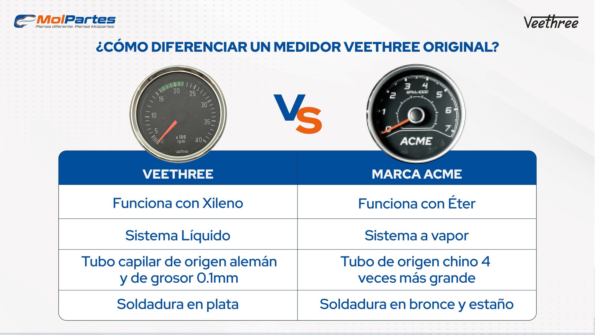 - Distribuidor: Asegúrate de comprar los medidores Veethree únicamente a través de distribuidores autorizados como Molpartes. Esto garantiza que estás adquiriendo un producto original con el respaldo oficial de la marca.